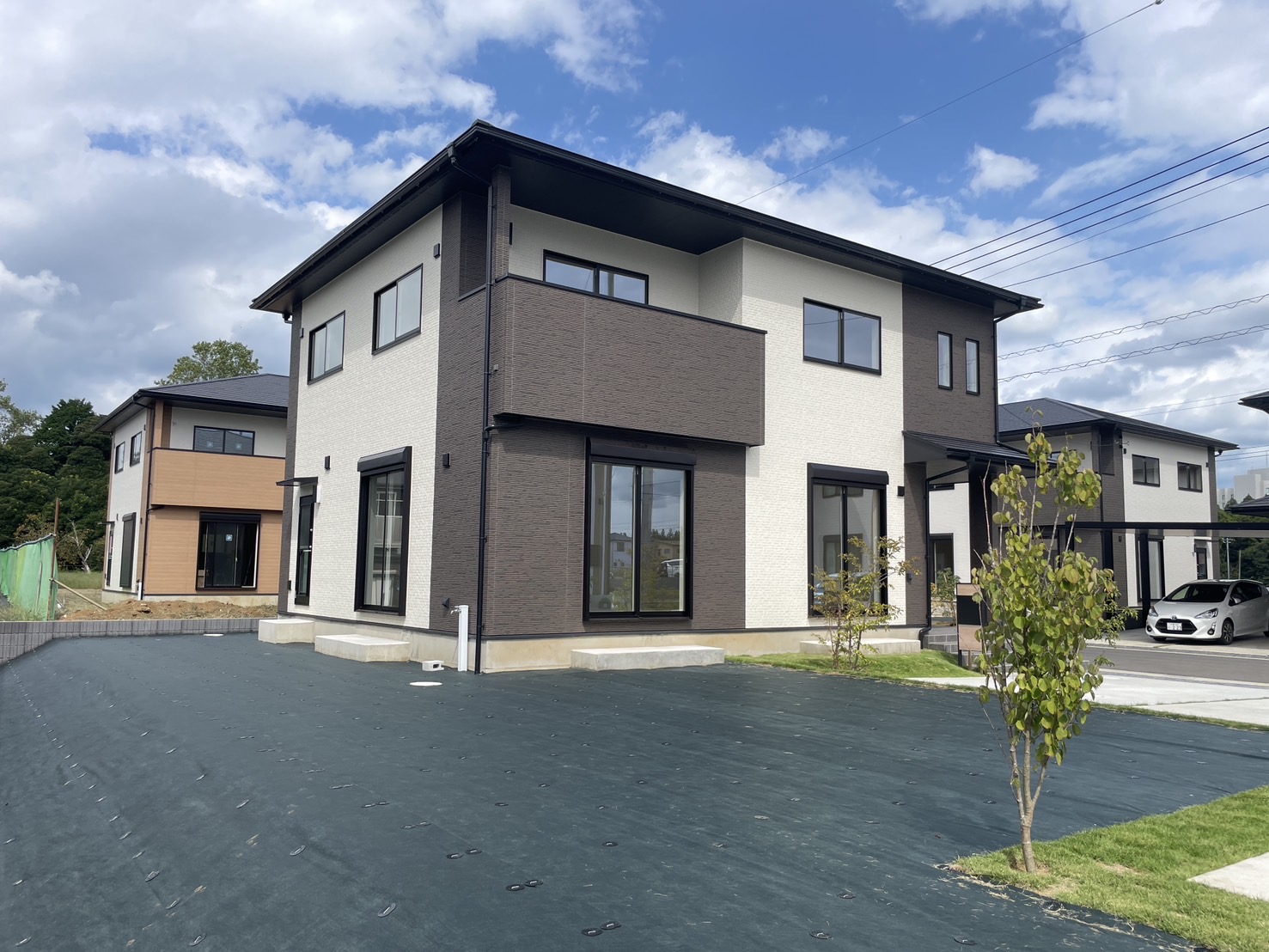 木造軸組従来工法で総2階のため、耐久性・耐震性・耐風性に優れています。見た目はシンプルなデザイン。