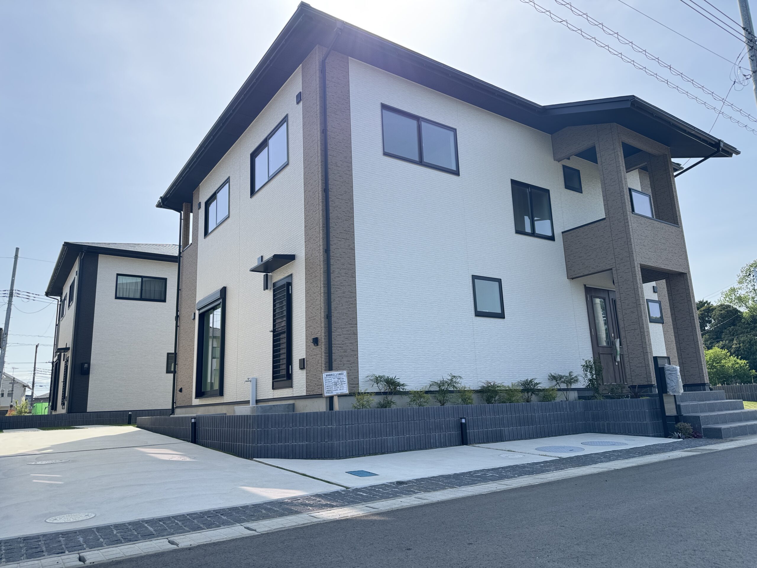木造軸組従来工法で総2階のため、耐久性・耐震性・耐風性に優れています。見た目はシンプルなデザイン。
